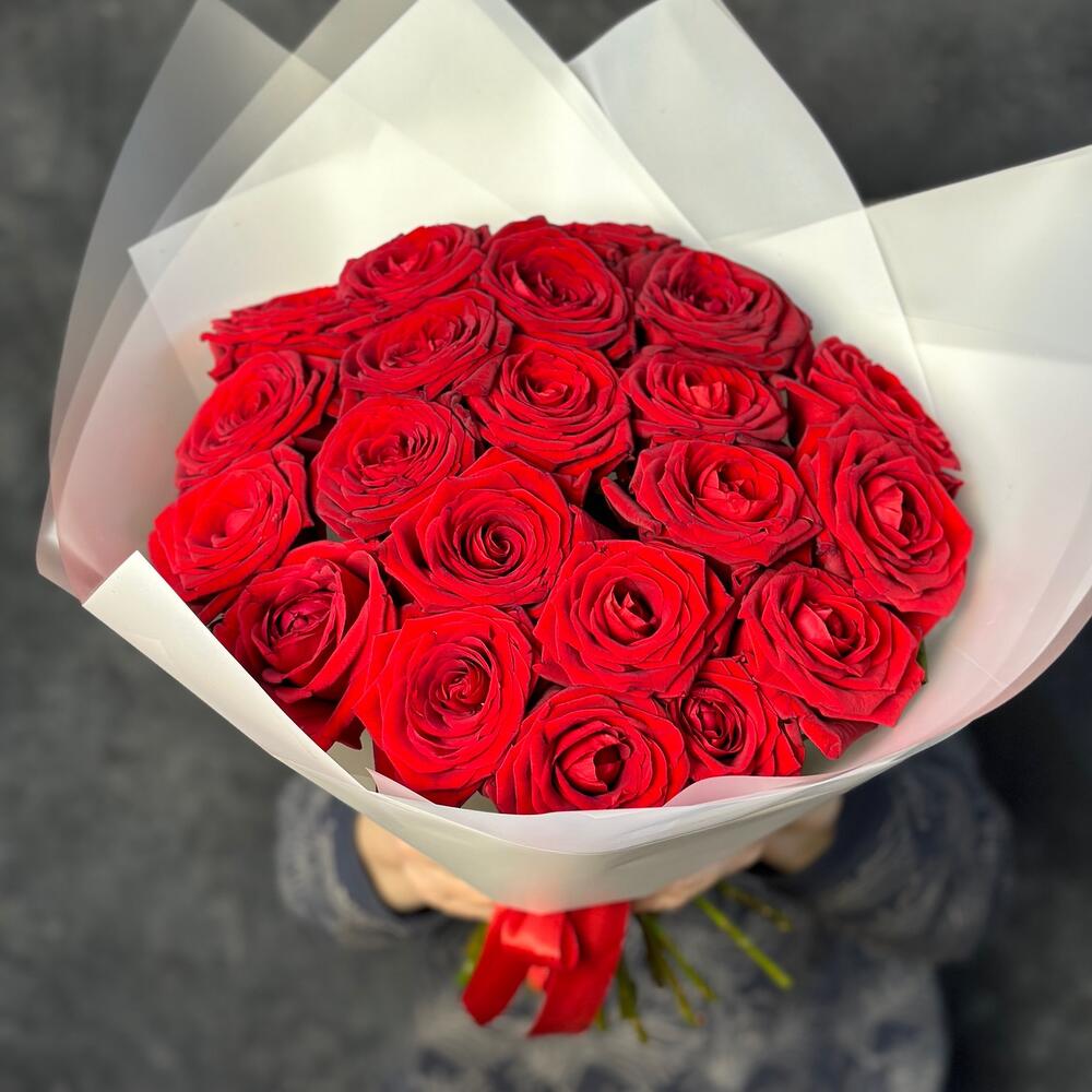 Букет из 21 ароматной красной розы можно купить в Кандыагаш и Актюбинской области за 18700 тенге с быстрой бесплатной доставкой в магазине букетов «Ultra Flowers»:
