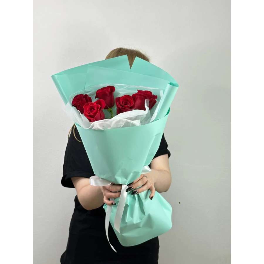 Прекрасный букет из 5 красных роз можно купить в Кандыагаш и Актюбинской области за 6000 тенге с быстрой бесплатной доставкой в магазине букетов «Ultra Flowers»:
